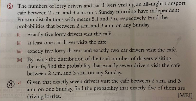 \[\dbinom{n}{r}\left(\dfrac{\lambda}{\lambda+\mu}\right)^r \left(\dfrac{\mu}{\lambda+\mu}\right)^{n-r}.\]If we had assumed that the probability that a visiting driver picked at random is a lorry driver is $\frac{\lambda}{\lambda+\mu}$, then we would have got the same answer without having to calculate any Poisson probabilities at all.